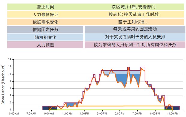 由于零售行业的特点是每天的业务量会有高峰低估的 波动,如果把这200个工时平均分配,就不能满足高峰时段的用工要求,同时也会造成业务不忙时的人员浪费。所以,在分配这些工时的时候,必须要有足够细的 时间段,也就是说预测业务量是按照较短的时间间隔来分布的,才能最大可能的保证人员投入与实际务量要求的吻合。