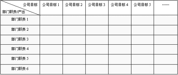 公司目标分解到部门时,通常纵向一致可以通过目标——职责矩阵分析表来完成。可以从部门的关键职责/产出,寻找部门产出中能够支撑公司目标的关键职责。因为组织中每个部门都有其存在的理由和价值,营销部门的使命当然要履行营销方面的工作,生产部门的使命当然要履行生产方面的工作,技术部门的使命当然要履行技术研发方面的工作,其它部门也是如此。我们就可以把公司目标分别分解到相关部门。比如新产品收入比重指标可以分解到营销部,涉及到生产目标则分解到生产部。这些目标都是部门关键职责所在,是部门可以直接控制的,从而成为了部门的关键绩效指标KPI。