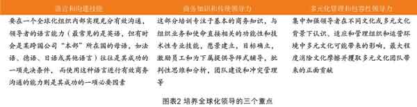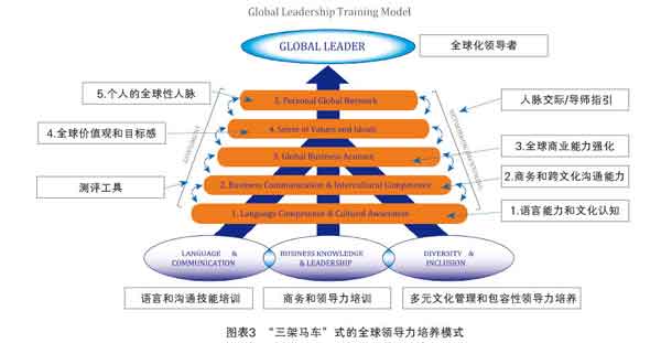 研究表明,培养全球领导力可以从语言和沟通技能培训、商务知识和传统领导力培训、多元文化管理与包容性领导力培养三方面着手,因此,贝立兹提出了“三驾马车”式的全球化领导力培养模式(见图表2、3)。