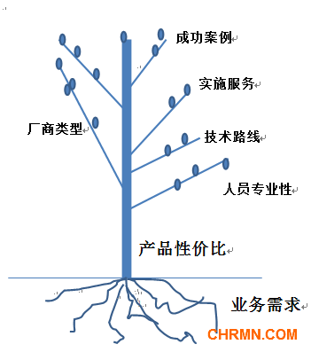 在选型中,软件供应商都会把其软件和解决方案中最好的一面展现出来,而有意规避其短板,如果缺乏对人力资源管理软件的深刻理解,那么决策者难以做出判断,决策过程必将限于患得患失、左右为难的纠结状态,成了让人力资源部门和IT部门都很头疼的一件事情。那么究竟该如何从众多的厂家中选择适合自己的系统呢?笔者根据多年企业人力资源管理系统建设的经验,尤其是与多家样板客户的交流总结,提出如下人力资源管理软件成功选型的树形模型: