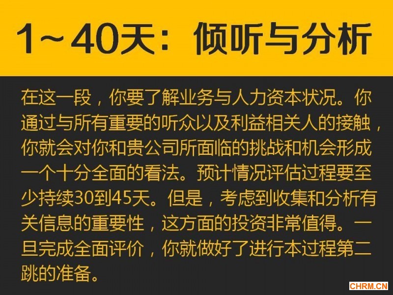 尽管这最初的100天可能有点像是在坐过山车,但是,你在这100天里按此做下去,你就会真正成为企业的业务合作伙伴,你就会成为企业内部关键人才的总管!