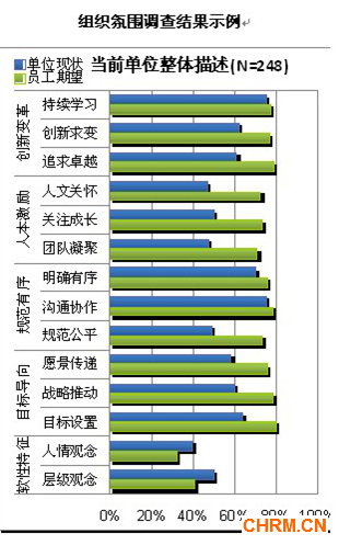 为了解组织与个人的相融性,企业需要一些工具来更好地明确组织的现状及员工的期待。组织氛围调查可以帮助企业更准确、详细地把握上述信息,了解员工动态,在政策制定、文化引导上更有的放矢。人 才管理软件云服务领导者北森(beisen.com)以组织氛围界著名的“对立-价值构架理论”为基础,从“灵活、适应与稳定、控制”和“关注内部与关注 外部”两大对立价值架构的交叉,归纳出创新变革、人本激励、规范有序和目标导向4个组织氛围特点,并根据中国企业的特点,增加人情观念、层级观念2个纬 度,形成了中国企业组织氛围调查问卷。