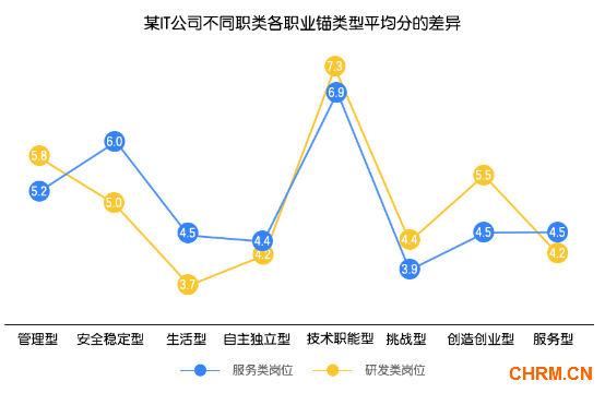 某IT公司内部员工职业锚测评发现,不同职类的员工在职业锚类型偏好上有差异。服务类岗位的员工(41人)在安全稳定型、生活型、服务型上得分相对较高,他们比研发人员追求稳定、生活工作平衡和帮助他人的倾向更强一些;而研发类岗位的员工(35人)在技术职能型、挑战型、创造创业型上的得分更高,研发类岗位能够满足他们对于提升专业能力、克服重重障碍和创新的需求。
