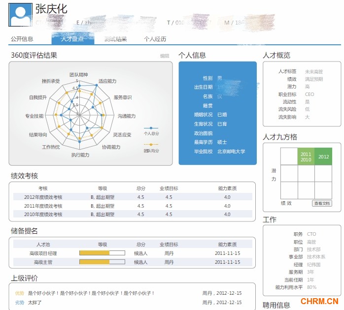 从 这个图上来看,这些信息是从不同地方获取来的。比如说员工的基本信息,包括一些项目经理的经历,可能是从他的EHR系统里面获取来的,测评结果可能是从北 森的测评系统里获取来的。人才地图就是九宫格的这种可能是从以前盘点的结果导入进来的。也有可能您有继任系统,或者专门做了一个什么样的系统,从那个系统 里获取来的。那领导力素质有可能会从360度评估系统里获取来,当然这个图里面还缺信息,如果更多的话还会展示绩效的一些信息。甚至是本次人才盘点,如果 还请候选人做了一些准备,可能还会有一些针对本次活动的一些辅助信息。