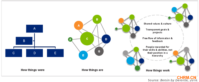 从20年前到现在,组织内部的结构已经发生很多变化,原来是层级式、职能式,变成互联网时代的网络式。内部的沟通协作,借助信息化的协同技术变成可能,但是今天这种网状结构,不再是一个单一的大网络。企业内部会有不同情况出现,就是小团队的崛起。举个例子,企业阶段性会有一些攻坚项目,这个项目本身就像一个小公司,它需要来自产品、研发、技术、销售、营销、财务等各个领域的人才,这个时候从体系中抽掉一批人,组成一个临时的攻坚项目小组,这样的组织形式在很多企业当中都是存在的。他们来自不同部门,打破了原来的层级和职能结构,自发靠专业组织起来,没有绝对的领导者。即便有Leader,也是这个团队在发育过程中自发产生的。于是团队怎么管理,怎么激励,评估的时候怎么评估其在非正式团队中的贡献,回到他全年的常规评估中,又要怎么奖励等,都是问题。这是组织形态发生的一些变化,于是也产生了一系列的关键词。