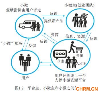第一类是平台主,即通过这些平台来产生多少创业团队和外部合伙人。第二 类是小微主,即一个创业团队。第三类是小微,即普通员工要变成创客。三者之 间的关系如图1.2所示。