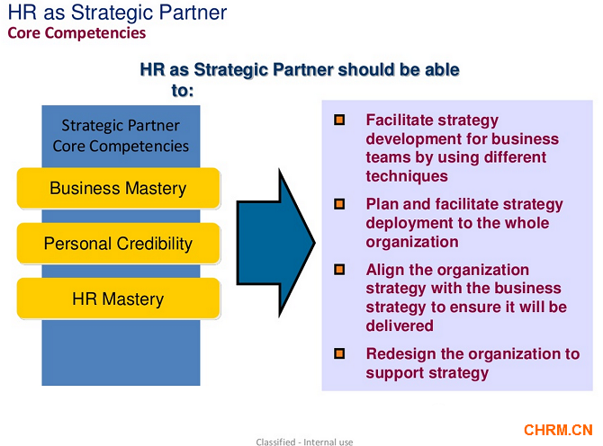 对人力资源部而言,成为战略伙伴是一个全新的角色,因此它可能需要具备新的能力和技巧。例如,人力资源部员工可能需要更多培训,才能在组织审查工作中做出深入的分析。最终,这些新知识将帮助人力资源部满怀信心地为管理层创造更多价值。而在不远的将来,把人力资源部当做战略伙伴的这一新理念必然会带来实际的商业利益。