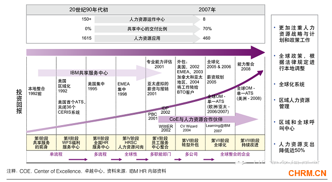 以 IBM 为例。自 20 世纪 90 年代早期,IBM 开始致力于人力资源转型。在经历了持续不断的创新实践后,到 2007 年,IBM 的 HR 转型达到了一个崭新的高度:它在组织运营层面实现了共享服务中心、专家中心和 HR 业务伙伴的架构。