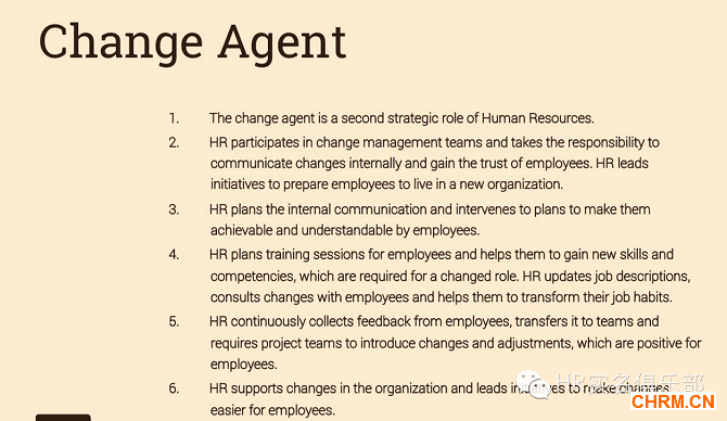 换句话说,人力资源经理的任务是带领大家提议、创造和议论一些最佳实践,比如文化变革项目或者评估与奖励体系中的最佳实践。