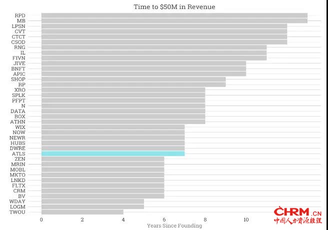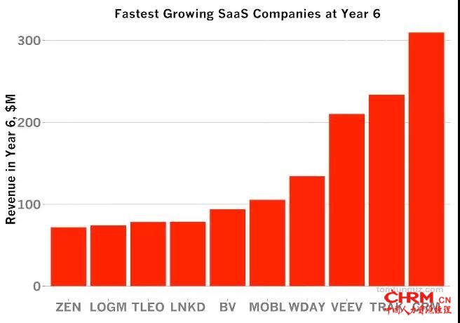 从上图可以看到,在美国,一个创业SaaS公司从零做到5000万美元年收入,用时并不相同。图上这些公司都是已经IPO的公司,因此并没有差公司混迹其中,这里都是好公司。这些好公司里里面,做到5000万美元年收入,最少的一家用时4年,最多的用时15年,平均大概需要7~8年时间。全球收入增长最快的10家公司是这样的,差不多6年做到接近一亿美元收入。