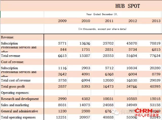 再看Hubspot,2013年的总收入是7700万美元左右,研发费用1500万,管理费用1400万,营销和市场的费用5300万美元。后者占比接近80%。