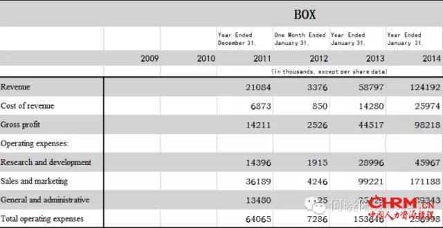 BOX 2014年的营收是1.24亿美元,扣税之后营收是9800万美元,成本是2.56亿美元。研发成本4600万美元,管理成本4000万美元左右,营销费用是1.72亿美元左右,也是1比4的关系。
