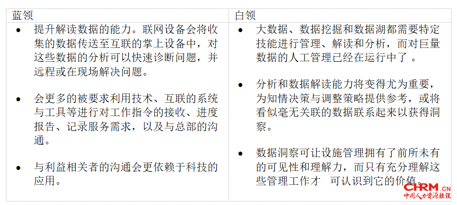 提升技能是必要的,但在以下两个为人熟知甚至略显过时的群体划分概念之间,会存在明显的差别——蓝领工人和白领职员。首先,这两类人员都将在未来工作中应用更多技术手段。但据麦肯锡的研究指出,针对蓝领工人,除了需要战略性思考或高度可重复的内容,他们的技能将不会发生太大改变。在另一方面,白领职员将会面临更多的变化。当当前的某些工作将会被科技取代,如数据和记录录入、管理和报告等。策略制定、创新性地调整既定措施很可能会是白领职员的主要职责。预计近期会出现的技能缺口(排序不分先后):
