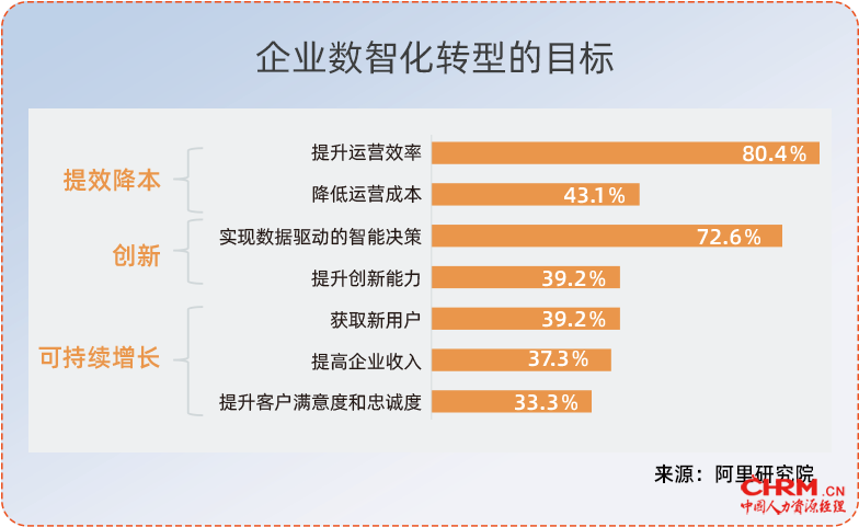 调研发现,当前企业数智化转型的主要目标包括提高运营效率、降低运营成本、实现数据驱动的智能决策以及获取新用户。