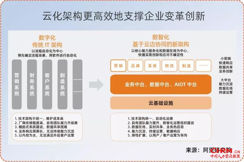 后台对稳定性的追求,前台对灵活性的追求,是企业运行中永远的“矛盾”。面对企业数智化转型中全链路数据集成的困境,云和中台战略是解决这一问题的新路径。长期以来企业数字化解决方案的出发点都是一个“点”出发,向“线或链”拓展,而企业真正需要的是一个全局优化解决方案。从传统IT架构向云、中台、移动化架构迁移,更容易实现数据集成、业务集成,实现技术架构统一、自动化运维,加速能力沉淀,快速敏捷响应客户需求,构建以用户运营为导向的新架构体系。