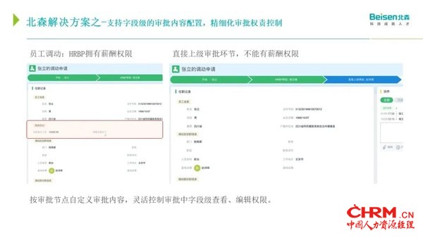 北森核心人力云的工作流解决方案则可提供“字段级”的精细化审批内容权限控制,可根据角色灵活控制审批节点中对于任意字段的查看、编辑权限。如在高潜员工的调动流程中,可以让HRBP拥有薪酬的权限,而在直接上级的审批环节中,却不能看到薪酬相关的内容。此外,该工作流解决方案还提供了“灵活到人”的审批人设置,根据其业务需求,可基于汇报关系、职务、职位、系统身份等组织规则来设置审批人,同时也可按流程变量、流程矩阵等灵活个性化地设置审批人,以此来满足企业多样化的审批关系需求。