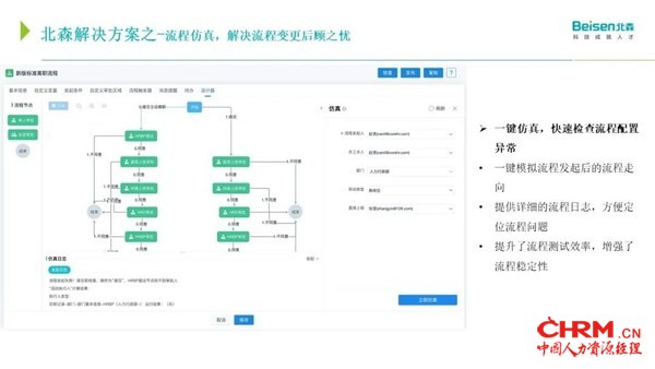 北森核心人力云中的流程产品正是为基于当前快速组织变革需要而设计的。其通过节点复制、流程条件复制、流程复制等功能来实现流程的快速复制、微调复用,敏捷响应变化。而产品中的循环审批功能则可在企业中各体系组织架构层级不统一时实现一个节点循环执行上级审批,直到达到审批要求。不同组织层级的体系则不需要分别配置,当组织架构层级调整时流程也无需调整,大幅简化了流程配置及后期维护的工作量。此外,产品中的流程矩阵功能可根据企业的审批职责划分,快速维护不同地点、不同职级等条件下的审批人,从而简化流程配置。当企业新增地点或在审批权责重新划分时,也可一键调整矩阵,进而调整所有流程的审批关系,极大地降低了流程修改工作量,确保流程运行的准确性。在组织调整后,流程产品中的一键仿真功能可让HR无需搭建虚拟环境,无需录入测试数据,即可一键进行模拟测试,查看新流程是否按照预期准确运行。