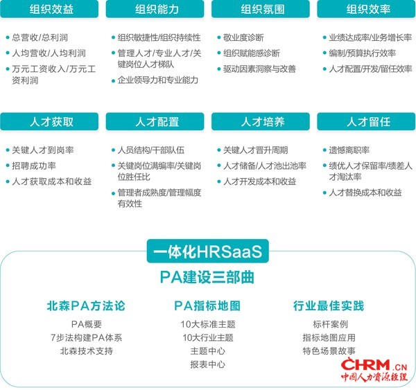 该方案中,北森整合了人力资源十大类标准主题,与各细分行业主题,包含100多项关键问题,数百项人力分析指标,并逐步预置到北森People Analytics应用中,形成指标库,帮助客户建立即开即用的PA指标地图。