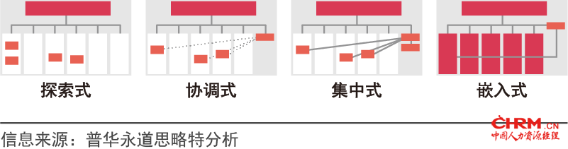 依据企业对数字化转型的不同应用程度,数字化推进方式可采用“探索式”、“协调式”、“集中式”、“嵌入式”四种方式(见图12)。关键是是否需要一个中心化的数字化管控组织。