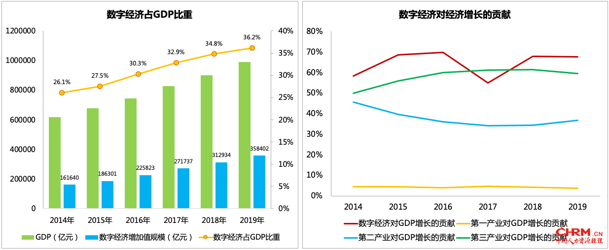 数字化重要性攀升背后,是其价值增长的体现。从宏观经济层面来看,随着信息革命的进一步推进,数据成为生产要素,数字经济成为核心经济形态。信通院在《中国数字经济发展白皮书(2020年)》中指出,我国数字经济增加值规模由2005年的2.6万亿元扩张到2019年的35.8万亿元,占GDP比重由14.2%提升至36.2%。同时,数字经济对GDP增长的贡献率也在不断提升,从2014年到2019年的六年间,我国数字经济对GDP增长始终保持在50%以上的贡献率,2019年更是达到了67.7%。这表明我国数字经济在国民经济中的地位更加突出,是驱动我国经济增长的核心关键力量。