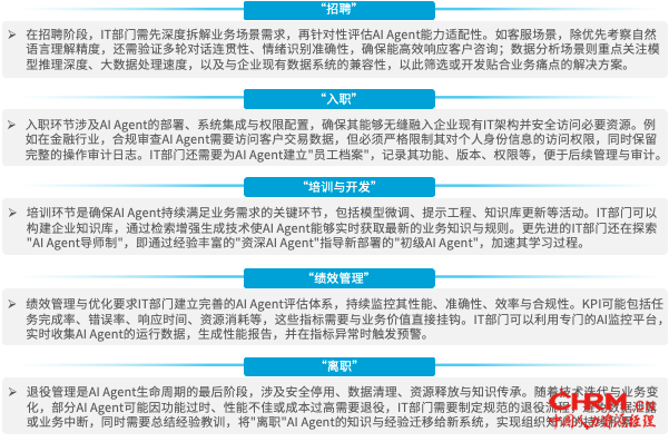 AI Agent的普及催生了IT部门的一个全新角色——"AI代理人力资源",负责AI Agent的全生命周期管理,包括"招聘"(选型和开发)、"入职"(部署和集成)、"培训"(微调和提示工程)、"绩效管理"(监控和优化)与"离职"(退役和替换)等环节。这一角色借鉴了人力资源管理的理论与方法,将AI Agent视为特殊的数字员工进行系统化管理。
