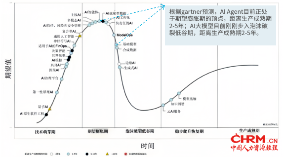相比视觉识别、语音识别、OCR等技术已经展现出高度成熟度,实现了规模化、稳定化的商业应用,根据Gartner技术成熟度曲线预测,AI大模型刚刚步入泡沫破裂的低谷期,预计未来2-5年进入生产成熟期;而AI Agent目前正处于期望膨胀期的顶点,同样需要2-5年才能成熟。