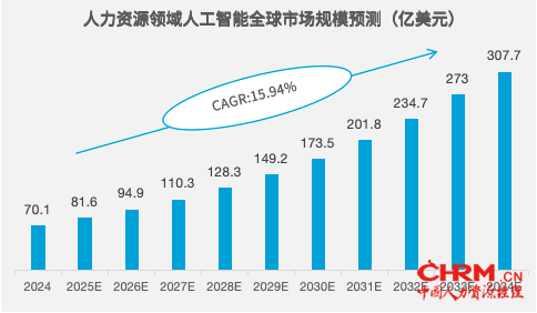 根据第三方研究机构报告,2024年全球人工智能在人力资源市场规模达到70.1亿美元,预计将从2025年的81.6亿美元增长到2034年的307.7亿美元,以15.94%的复合年增长率增长。 人力资源市场中,人工智能呈现出指数级增长,这得益于高效人才招聘、个性化员工体验以及数据驱动决策的需求。