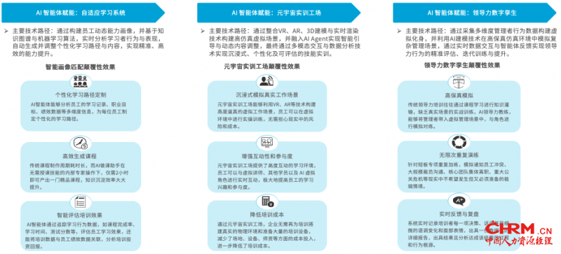 在企业培训与开发中,AI智能体提供个性化助力。自适应学习系统定制学习路径、生成课程并评估效果;元宇宙实训工场借VR等技术打造沉浸式场景,增强互动还降本;领导力数字孪生通过数据与AI建模,模拟管理场景助力领导力提升,推动企业培训变革。