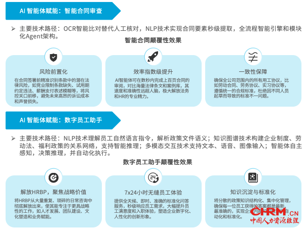 AI智能体通过多类智能应用发挥关键价值:在智能合同管理上,借助OCR、NLP等技术审阅法律条款,精准识别用工协议风险点,实现风险前置、效率提升与标准统一;数字员工助手,依托NLP、知识图谱等技术,高效响应员工常规咨询,大幅减轻HRBP事务性工作压力,使其能聚焦更具战略价值的工作,全方位助力企业优化劳动关系管理,提升组织效能。