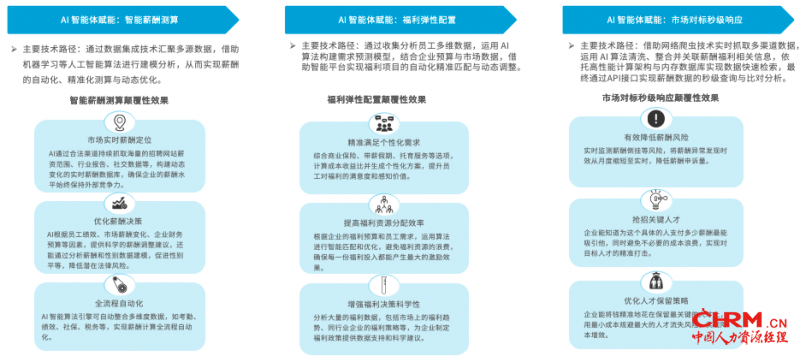 在企业薪酬福利管理中,AI智能体作用显著。智能薪酬测算整合多源数据,借算法实现测算自动化、精准化与动态优化;福利弹性配置分析员工数据,构建模型精准匹配福利,提升分配效率与决策科学性;市场对标秒级响应靠数据抓取和算法,快速检索比对薪酬数据,降低薪酬风险、助力抢才与优化人才保留,推动管理智能化升级。