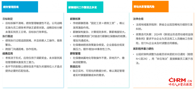 在企业人力资源管理领域,当下存在诸多亟待解决的痛点。人力资源规划与业务脱节,人岗匹配度低;人才选拔配置依赖人工,效率与精准度不足;培训忽视差异、效果难评估;绩效管理目标分解、执行及应用均有欠缺;薪酬福利核算繁琐、数据应用弱;劳动关系管理存在法律与流程风险。这些痛点综合起来,对企业人力资源管理的效率与效能提升形成了制约。