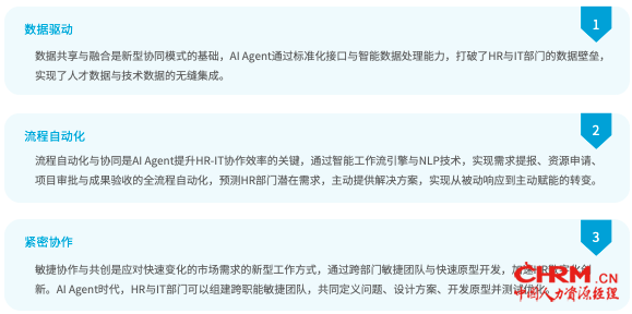 AI Agent的普及将推动企业组织形态向更扁平化、网络化与敏捷化的方向演进,人力资源部门与IT部门的协同模式也将随之变革。AI Agent技术催生的人力资源与IT部门新型协同模式,其核心特征是数据驱动、流程自动化与紧密协作。