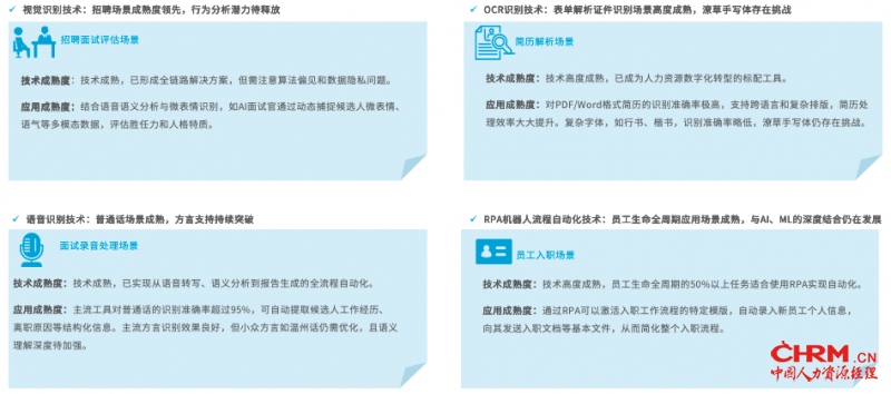 人力资源行业的AI技术应用已从单点工具升级为全链路解决方案,其中视觉识别在招聘场景中、语音识别在面试录音场景中、OCR 在简历识别场景中、RPA在全流程自动化场景中均展现出高度成熟度。