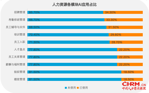 SaaS平台的应用场景覆盖招聘、核心人事管理、薪酬福利管理和人才培训等人力资源管理的全流程。从细分模块来看,AI在招聘场景渗透率高,但在绩效管理、组织发展等模块智能化率低。