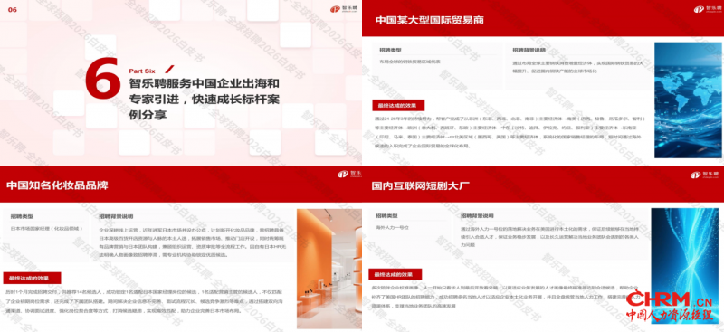 本篇章精选智乐聘服务不同行业、不同出海需求企业的标杆案例,涵盖国际贸易、化妆品、互联网短剧、智能硬件、半导体、家电等多个领域,涉及全球区域销售团队搭建、海外国家经理招聘、海外人力体系搭建、高端技术专家引进等多种招聘类型,详细呈现招聘背景、核心难点与最终服务效果,让企业直观感受专业出海招聘服务的落地价值,为不同类型企业的出海招聘工作提供可借鉴的实操范本。
