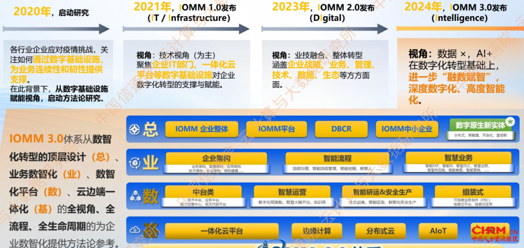 最后这把尺子,来自中国信息通信研究院(中国信通院)在2024年数字化转型发展大会上发布的 《企业数智化成熟度模型 IOMM 3.0》。它的名字里有个“智”字,特别突出了当前“人工智能(AI)”与数字化融合的新趋势。