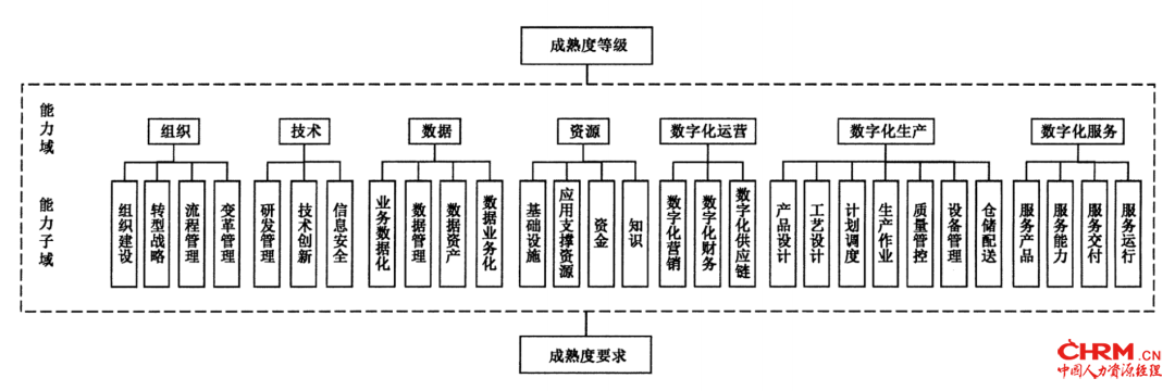 它把数字化转型需要的能力,分成了7个能力域,包括:组织、技术、数据、资源、数字化运营、数字化生产、数字化服务。每个大类下面又细分成很多小项(能力子域),比如“组织”下面有组织建设、转型战略;“数字化生产”下面有产品设计、计划调度、质量管控等。它关心你的企业在这些方面做得怎么样。