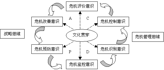 战略思维统率下建立的危机管理思维。危机管理思维主要建立于对危机事发前的企业危机防范、监测和预控。企业在组织架构设置的同时应该具有战略目光建立独立的或者矩阵式的危机管理中心,危机管理中心培训和发展领导层次的危机管理思维,从危机的预防、发生以及危机的分析、评价总结,在最高领导者的参与下,从上而下建立危机管理思维。但危机管理中心要注意危机管理的核心思想,也避免将危机管理的思维在员工心目中形成“前怕狼后怕虎”的定性思维,也不能因为过分的危机管理而事事约束员工的创造思维。如下流程图: