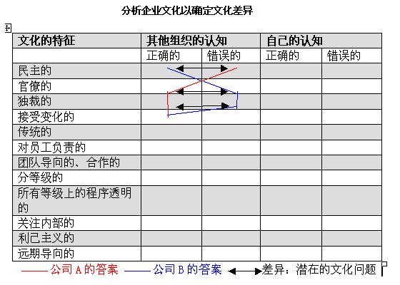企业文化的分析是用来确定和克服合作双方文化差异的工具。一项具体的分析显示双方员工的相同和不同点。这样,就可以通过分析的结果,来改进沟通和相互之间的交往方式。