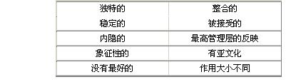 组织文化还有其他一些重要特征。首先,对于企业来说,没有“最好的”文化。文化取决于组织的目标、所处的行业、竞争的性质以及其他环境因素。第二,只有当文化的所有因素普遍整合在一起时,文化才能更好地被接受。第三,绝大多数组织成员如果不是拥戴组织文化的话,至少也应该接受它的假定和价值观。在过去,员工很少直接谈论他们工作的文化;近来,文化已经成为日益被员工接受的谈论话题。第四,大部分文化都是由最高管理层直接创造的,他们的言论会对员工有很大影响。然而,管理者的行为对那些警觉性很高的员工来说尤其重要,这些员工能在管理者对某些想法比如客户服务或产品质量刚口头有所表示但并没有真正支持时,就立刻觉察到。第五,文化可能是存在于整个组织的,或者是由一些不同的“亚文化”——地区、分支机构、分厂、部门——合而成的。最后,文化的作用大小各异——可能很大,也可能很弱,取决于它们对员工行为影响的程度,以及潜在信念和价值观被接受的广泛程度。