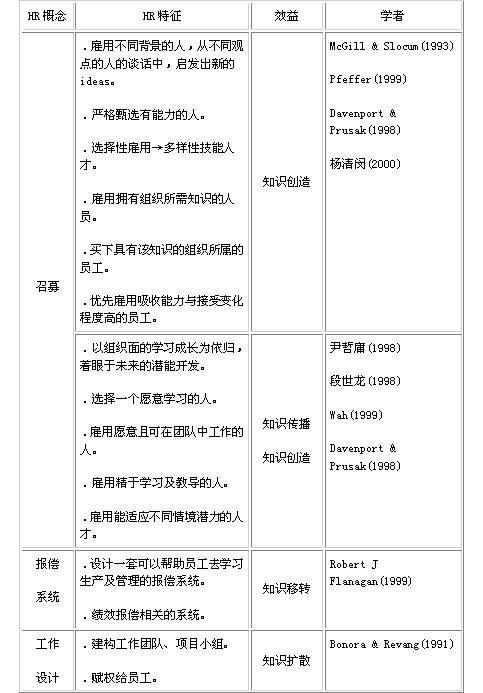 对于以知识为主要竞争优势来源的企业而言,如何促进知识的吸收、创造、蓄积以及维持,无疑是最重要的管理活动。然而知识本身具有无形性,故知识管理活动应着重在人力资源,因为人力为组织核心的策略性资源,其本身所具有的内隐性知识,不若外显性知识可透过信息系统加以储存与管理,故人力资源管理者在知识管理上扮演着非常重要的角色。Roberts(2000)认为科技并不能解决组织对于分享知识的抗拒,因为在大部分的组织里,知识仍然是权力的来源,分享知识就像放弃权力,如果没有任何激励措施去促使员工分享知识,员工仍会不愿意和他人分享所知,既然HR人员的工作会影响到训练、改变管理、报偿和诱因方案,则他们应该可以帮助组织去促进及奖励员工分享知识,故HR人员应该去参与KM的工作,因为KM会使得人力资本的使用更有效;由此可知人力资源管理者实不应在知识管理上缺席。