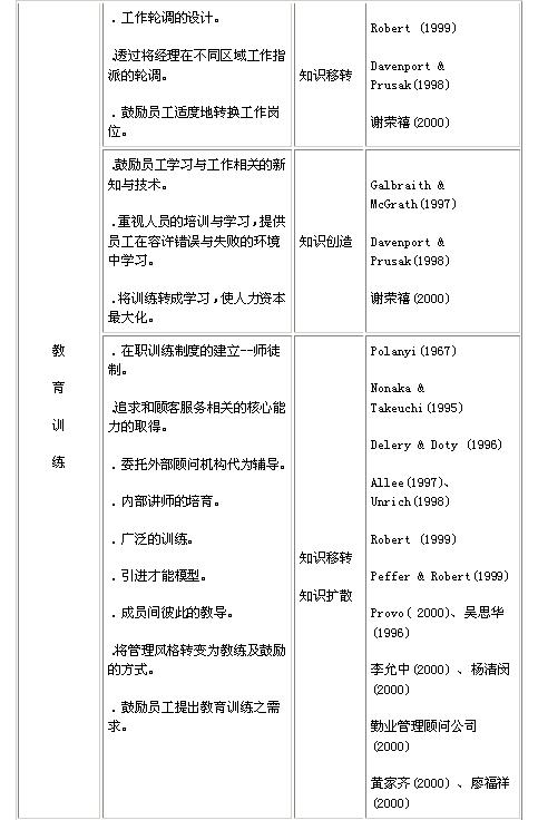 (2) 教育训练上须配合员工为中心的发展,而方式包括以师徒制传承经验、传递组织对知识看法的价值观于训练课程中、使员工学会对新信息科技的应用、引进与传播新知识、以及培养员工自我学习能力。