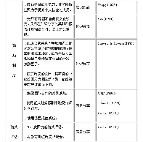 (4) 在激励制度上,设计奖励创新与知识分享的诱因系统,包括象征性诱因与财务性诱因,并配合绩效考核制度的运作,双管齐下。