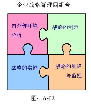 绩效管理不是单独的理论或实践,它应当是企业战略管理的一个非常重要的有机组成部分。企业战略是关于如何完成某一阶段内的使命和目标的一系列决策和行动计划。战略管理即是对战略的形成与实施过程的管理,包括四个组成部分(或步骤):企业内外部环境分析、战略的制定、战略的实施和测评与监控(图:A-01)。