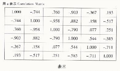 按照前述的πPV法计算步骤,首先计算表二各评价要素之间的相关系数矩阵,使用spss统计软件中“主成份分析”子程序的变量相关系数计算功能,需要进行选项设置,在SPSS10中设置如下:在分析窗口输入表一数据后,菜单选择Analyze一Data reduction→Factor→“Descriptives”选项卡下的“correlation matrix”中“coefficients”项目打勾选中;回到Factor→“Extraction”选项卡下“Number of factor”,输入评价指标数目,表二有6个评价因素,那么就应该输入6;其他设置使用软件默认值。回车计算得到表二的相关系数矩阵为表三。