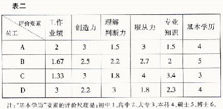 所以员工绩效评价的最终排序为DBAC。如果把各评价要素得分直接相加,按照得分多少进行排序所得到的评价结果(见表七),则是CBDA。