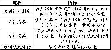 以人力资源部的培训专员为例,他的工作主要是围绕着培训业务流程来运作的,如果根据培训这个流程来进行考核,每一个流程都达到公司设定的目标,整体工作的最终结果就能够保证(见下表)。