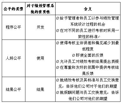 可接受性是指运用绩效管理系统的人是否能够接受它。可接受性受到员工在多大程度上认为绩效管理系统是公平的这样一种情况的影响。如下表所示,能够被感知到的公平可以划分为三种类型:程序公平、人际公平和结果公平,而在该标的含义一栏中所例举的一些步骤,可以确保绩效管理系统被大家认为是公平的。