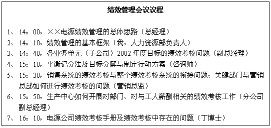 大约2周以后,公司召集相关人员召开第一次绩效管理会议。这次会议是电源公司“产、学、研”相结合的管理风格的集中体现。这次会议在介绍电源公司绩效管理的总体思路和基本框架的基础上,提出了2002年度各子公司面临的绩效考核问题;然后由和君创业的一位咨询师讲解了连夜赶写的关于平衡记分卡的教材,这次培训给我了不少启发。营销系统和生产系统都汇报了各自面临的考核问题。最后由丁博士作为邀请嘉宾发言,对我修订的绩效考核手册及考核中存在的问题进行了建议。在这次会议以后,随着项目的结束,丁博士渐渐淡出了电源公司的各类会议,考核中出现的各种问题就留给了可怜的HR—我。