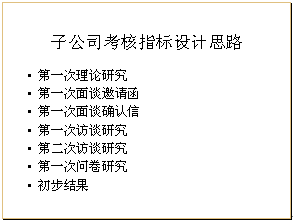 10、第二次访谈研究:根据“表e:分公司绩效考核指标体系初稿”,对3位办公室主任进行访谈,主要集中在2个问题:“初稿中的关键成功因素和测量指标对你的公司来说是否具有代表性和操作性?如果需要修改,应该怎么修改?”、“初稿中列举的对测量指标的评价方法是否合适?还有更合适的方法吗?”。